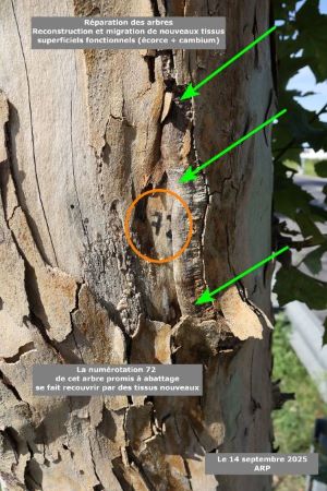 Marqueur flagrant, une numérotation d’un arbre promis à abattage entrain de se faire recouvrir par des tissus neufs !