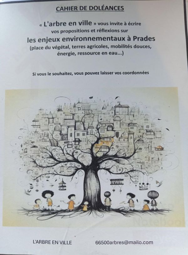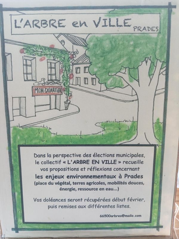 Dans la perspective des élections municipales des 15 et 22 mars, le collectif « L’ARBRE EN VILLE » propose aux Pradéens et Pradéennes de donner leurs propositions et réflexions concernant les enjeux environnementaux à Prades (place du végétal, terres agricoles, mobilités douces, énergie, ressource en eau,